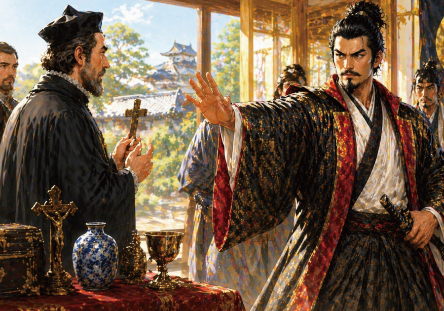 この世界線が史実と大きく分かれたのは、織田信長が比叡山焼き討ちと一向一揆との長期対立を経て、宗教勢力の複雑さに深く疲弊した時期である。史実の信長は、仏教勢力を抑えるためにキリスト教を“外圧”として利用したが、この世界線では逆に、宗教対立そのものをこれ以上国内に持ち込みたくないという思いが強まっていった。そこへ南蛮人がもたらすキリスト教の布教活動が重なり、信長は「新たな宗教勢力の台頭は、天下統一の障害になる」と判断するようになる。